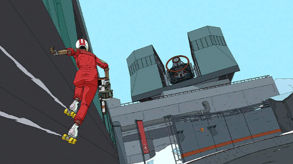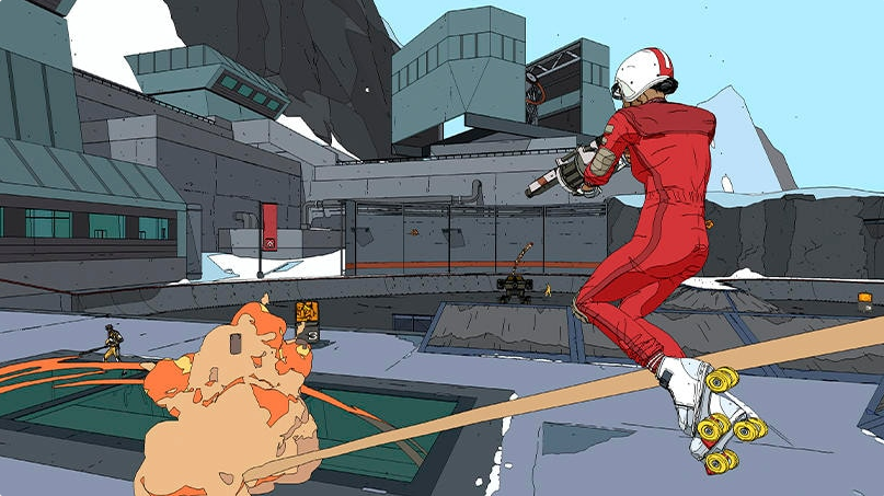 《Rollerdrome》的艺术风格简单粗暴,向重金属致敬,游戏采用粗砺的风格,使用轮廓和纯色表现出迷幻幻想和超现实主义的科幻混合美感。为了实现工作室独特的插画风格游戏画面(需要大量的边缘检测和线条渲染)Roll7的技术艺术家们利用Unity的可扩展性,构建了自己的渲染器。