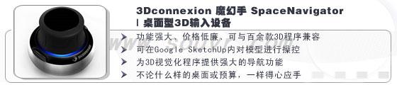3Dconnexion的SpaceNavigator™为超流行超强大的3D应用程序提供了自然而灵敏的3D环境和物体的操控方式。可与当今100余个超流行的功能强大的3D应用程序配套使用,其中适合与Google Earth第4版及Google SketchUp一起使用。