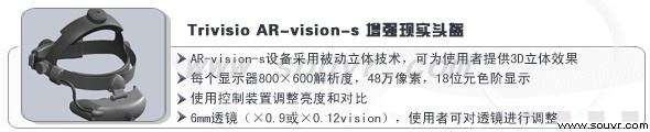 AR-vision-s是一款应用于虚拟实境的专业产品。此款『头戴式显示器(HMD)』,主要透过靠近眼部的微型显示器投射影像或视讯媒体。