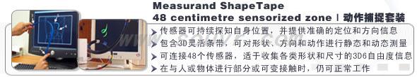 ShapeTape包含3D灵活条带,可对形状、位置、方向和动作进行静态和动态测量。 产品中的光纤3D盘绕式传感器可持续探知自身位置,并提供准确的定位和方向信息,甚至在与人或物体进行部分或可变接触时,仍可正常工作。ShapeTape可独立使用,也可与其它设备连接或与人连接使用,生成实时3D计算机图像并收集与复杂图形相对应的数据。目前一款高速(10kHz)非多元版本产品已经推出,可用于快速数据获取。