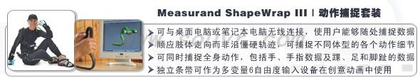 ShapeWrap III可同时捕捉全身动作,包括手、手指数据以及踝、足和脚趾的数据。该产品非常灵活,可清楚地辨别手指和脚趾的动作,并与手和脚的动作进行区分;此外该产品还能对其它关节、背部和头部的动作进行探测。可佩戴的传感条带完全贴合手臂和腿,并延伸至手指和脚趾,可捕捉这些部位的完整的6自由度数据。ShapeWrap III系统的臂部条带可捕捉腕部的屈伸以及外展和内收,还可捕捉手指的动作。