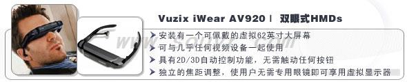 - Vuzix的AV920安装有一个可佩戴的虚拟62英寸大屏幕,可与几乎任何音频/视频设备兼容