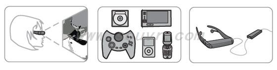- iWear AV920可与几乎所有具有视频输出功能的NTSC或PAL制式音频/视频设备连接使用