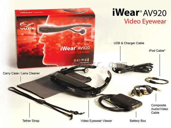 AV920还能和您的iPod一起使用!小巧的内置锂离子电池供电,可持续使用五小时,iWear轻盈而符合人类工程学的设计确保用户长时间使用本品仍能感觉无比舒适。AV920能够提供移动中的超级大屏幕体验。