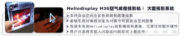 Heliodisplay H36多媒体解决方案能够生成对角线长度为36英寸(91厘米)可视自由空间图像,产品包括专有的Heliodisplay投影模块和基座,无需任何额外硬件。基座重量约为15磅(6.8公斤),或低于标准PC机种,使用50瓦伊内灯泡。耗能约0.080L/小时,该系统运行主要使用空气,对环境没有影响。用户只需将其插入闪驱或PC机即可上载文件。