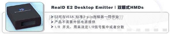 RealD E2 Desktop Emitter 是一台红外线发射器,使用在Stereo Graphics、Crystal Eyes 立体3D显示系统上。E2 利用新一代立体显示卡,且使用VESA 标准3-pin mini-DIN连接器。