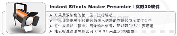 本产品结合了S3D Presenter的全部功能以及创作工具包。除此两种产品外,Master Presenter还可支持现场低延迟平面视频输入(HDMI或组件格式,使用BlackMagic设计公司的动作捕获设备,需要单独购买),配合相应的显卡设备,最高分辨率可达1920 x 1200像素。