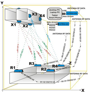 下图显示了其中一个定位应用。对象按照相对位置定位,并摆放位置。数据流从hx19接收器R1、R2、R3、R4发出,发送频率为2.4GHz以内。图中所示的是一个简单的操作,hx19ms与发射器、接收器等周边设备同步,接收器的内部处理器会计算出超声波信号的传输时间。定位数据通过USB或者串行端口导入到计算机、掌上电脑、平板电脑、智能手机等数据读取设备上进行处理。