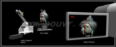 由激光器在物体上投影出来的线性被照相机通过转盘的旋转进行全360度捕获。照相机的图像由TriAngles软件处理,创建一个对物体的虚拟呈现。