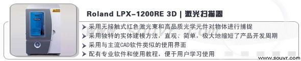 高分辨率一键式自动扫描仪与Roland LPX EZ Studio™软件相结合,可以对从初始扫描到3D CAD/CG数据制作的全部流程进行控制。设计文件可以保存为多种3D CAD格式,包括:STL(立体光刻)、GSF(几何系统的原生文件格式)、3DM(Rhinoceros软件文件格式)和PIX(Roland Picza格式)。