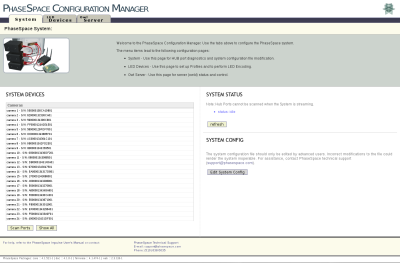 这是配置和安装IMPULSE 系统的主界面。 使用PHP编写,可通过任何网络浏览器直接访问配置管理。运动捕捉系统由此可通过一个网络或甚至是互联网进行远程配置。
