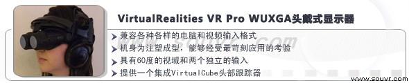 VirtualRealities VR Pro WUXGA头戴式显示器具有60度的视域和两个独立的输入。VR Pro WUXGA可连接到任何2 x VGA、DVI、复合视频或 S-视频源,并提供一个集成VirtualCube头部跟踪器。