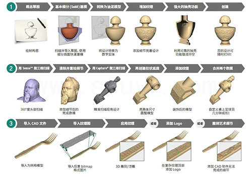 可轻松导入 STL、CAD、扫描和其他各类来源的 3D 数据,并直接应用到设计当中。能够快速修正缺损和低质量的 3D 数据,获得平滑可操作的模型。采用雕刻和浮雕工具,塑造纹理层的真实感。能够即刻 3D 打印出实体几何用于传统制造业,或轻松以多种格式导出,供下游工作流程使用。
