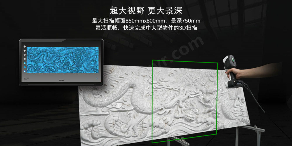 超大视野 更大景深:最大扫描幅面580mmx550mm,景深720mm,灵活顺畅,快速完成中大型物件的3D扫描;