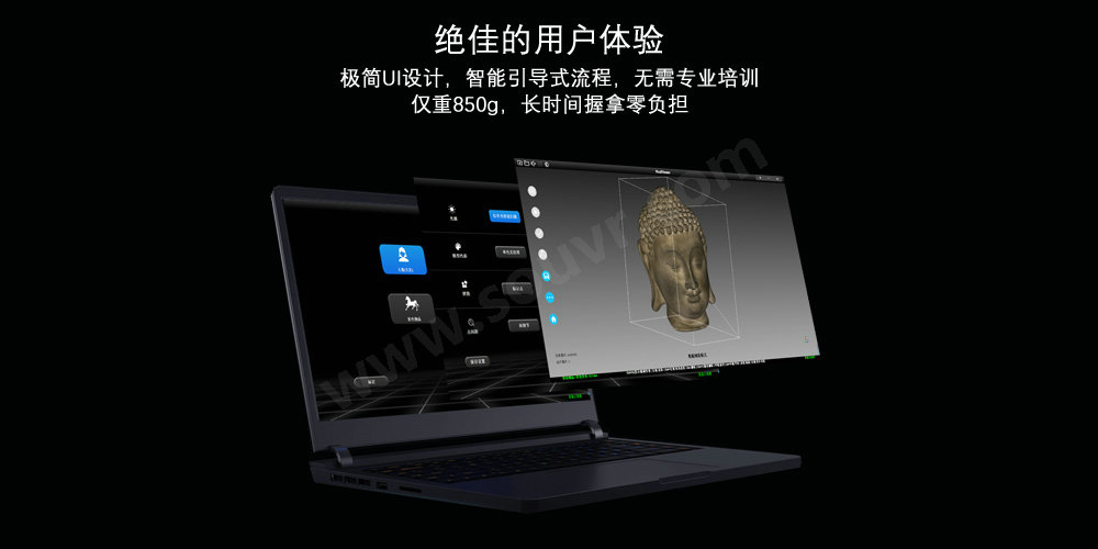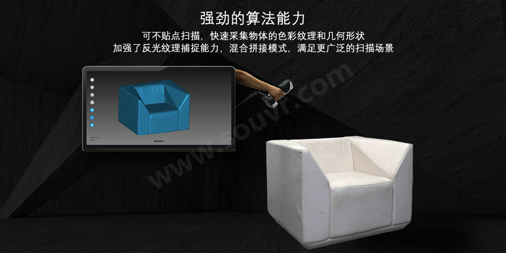 强劲的算法能力:可不贴点扫描,快速采集物体的色彩纹理和几何形状;加强了反光纹理捕捉能力;混合拼接模式,满足更广泛的扫描场景。
